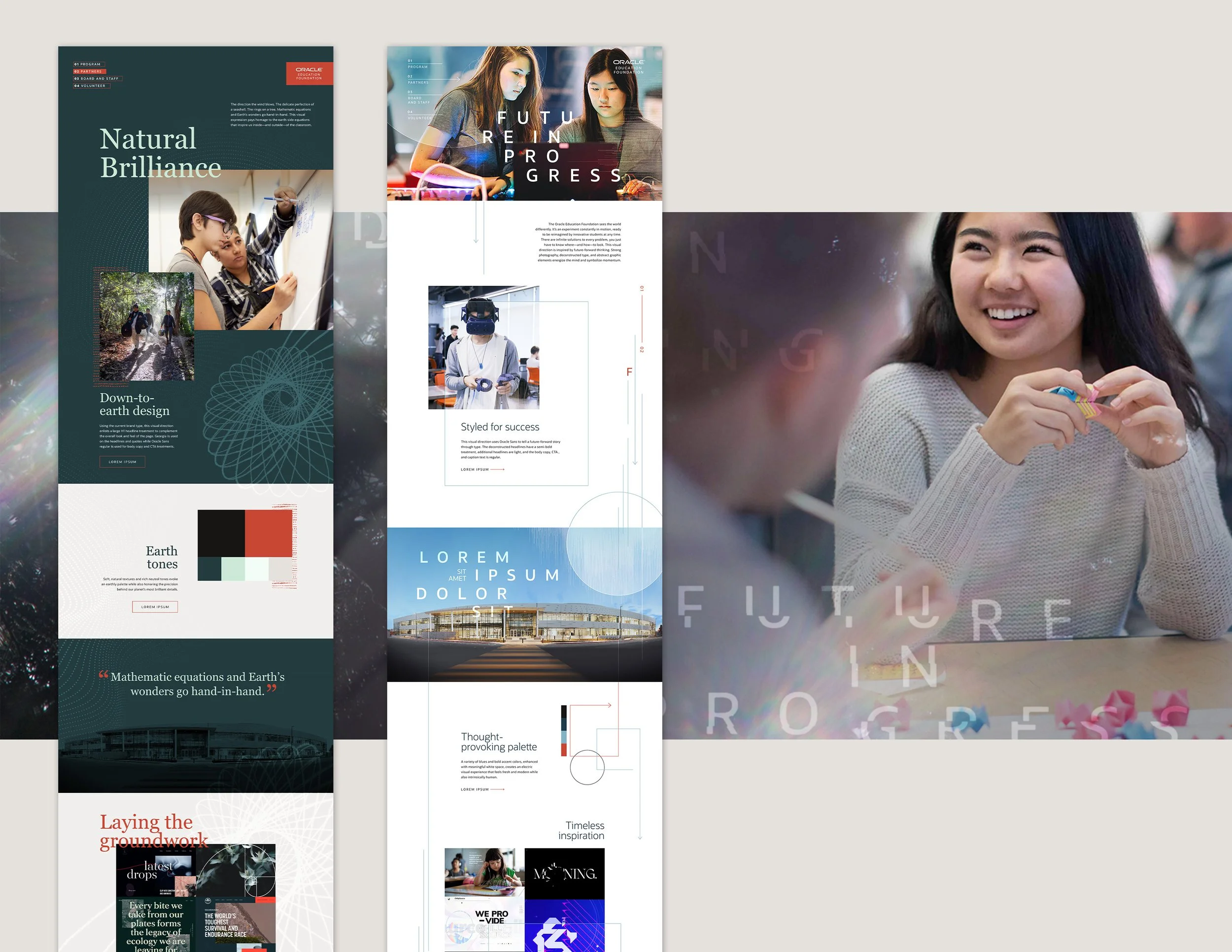 Oracle Education Foundation asked us to envision a unique and sophisticated visual approach that will create a feeling of optimism and pique curiosity about their mission. Collaborating with a designer and copywriter in Figma, we provided two distinct concepts including the chosen concept, Future in Progress, which used deconstructed visual elements to channel the forward-moving energy of the Foundation's futuristic thinking.